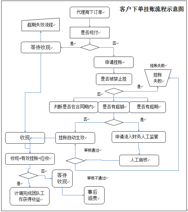无论代理商是否有额度,是否超期,都可以进行下单预定,但在一定时间范围内未付现或未得到有效挂账,订单会被自动清除。